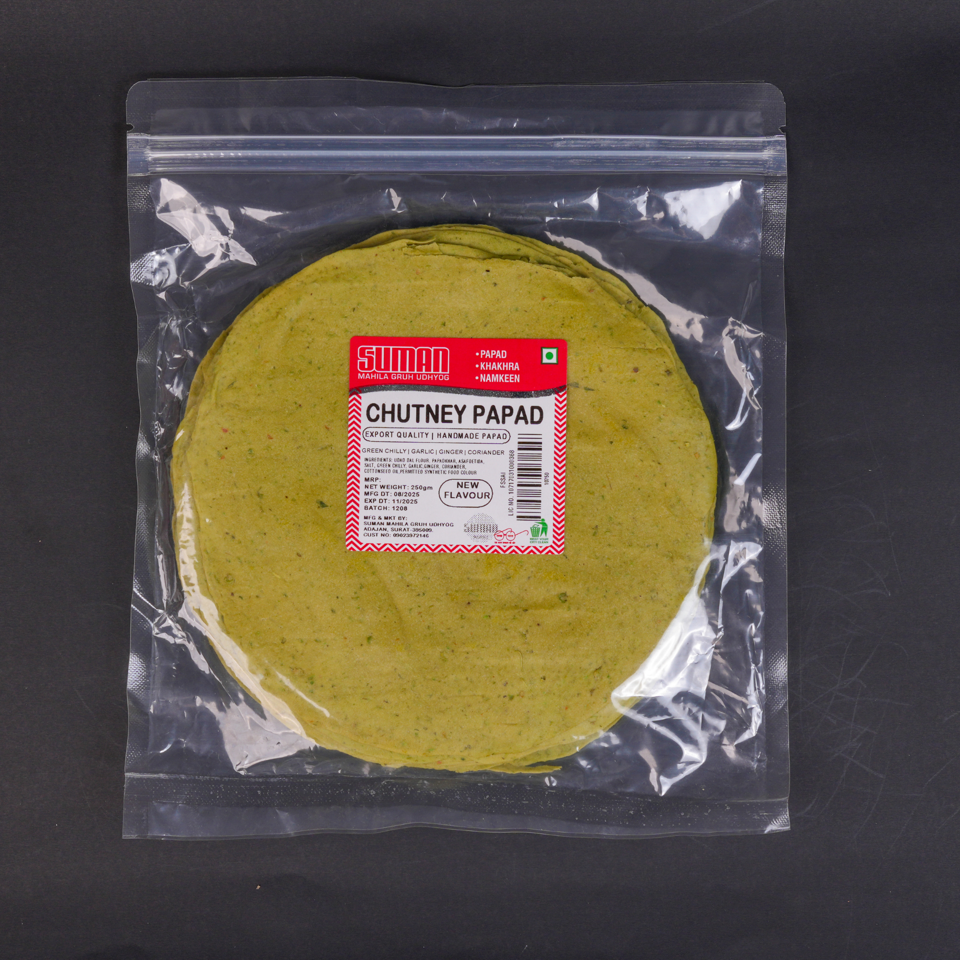 Chutney Papad is crafted by blending flavorful chutney spices into a crisp, thin papad, creating a unique fusion of tangy and savory notes. Its vibrant taste and crunchy texture make it a perfect accompaniment to meals or an innovative snack option for those seeking authentic, bold flavors.