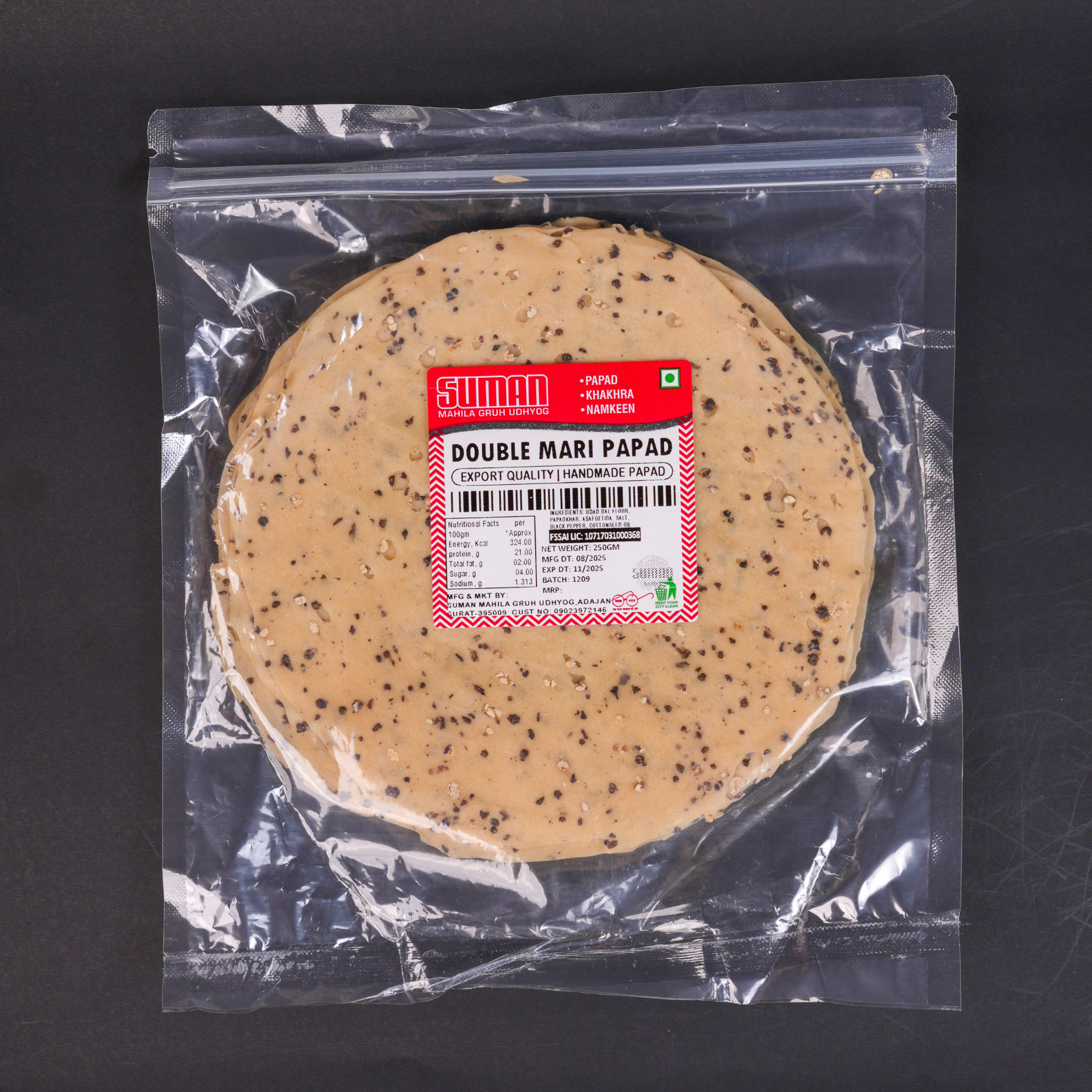 Double Mari Papad features a uniquely layered texture, combining two thin sheets for enhanced crispness and durability. Expertly prepared with traditional spices, it delivers a rich, authentic flavor that complements a variety of meals. Ideal for those seeking a satisfying crunch and a more substantial papad experience.