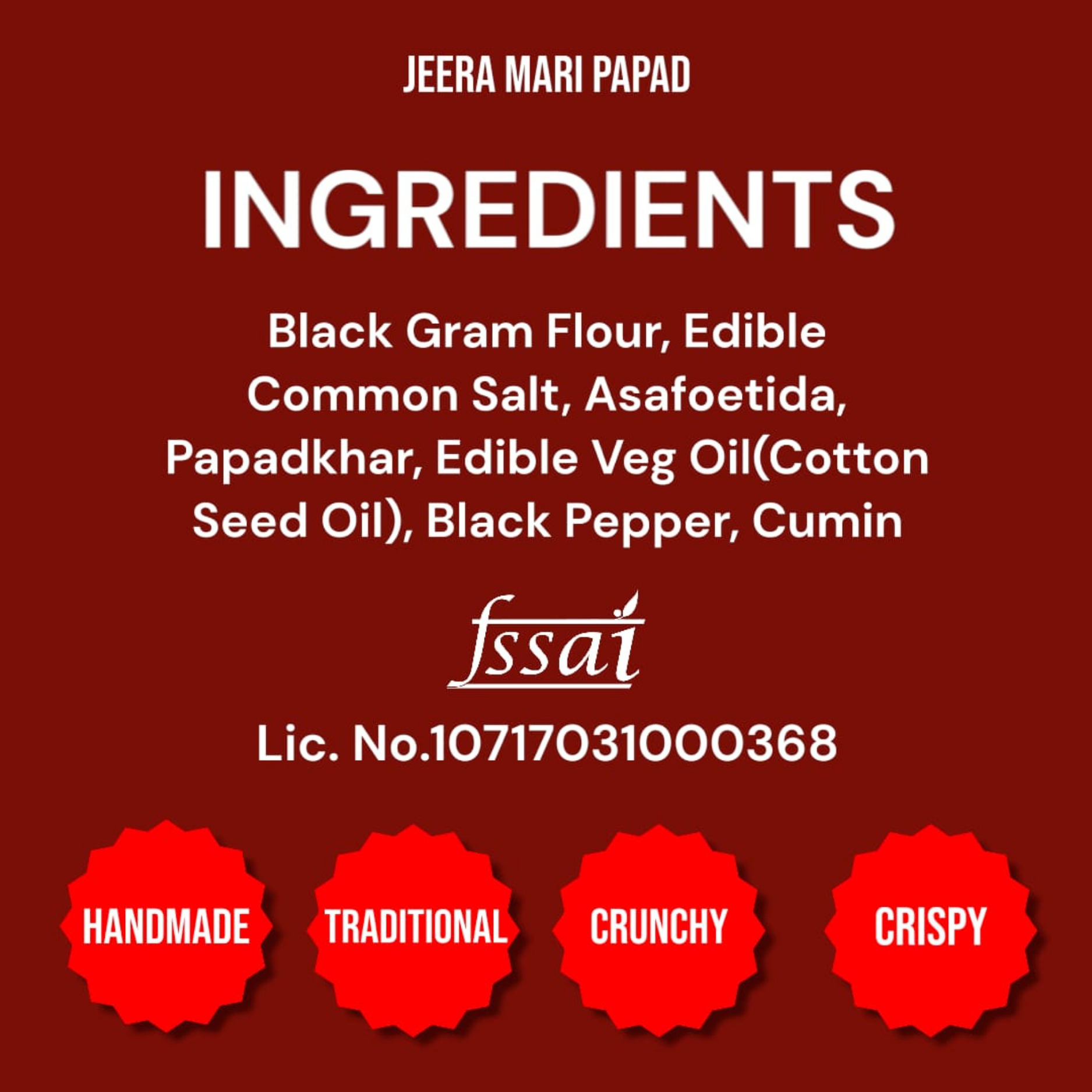 Jeera Mari Papad combines the aromatic warmth of cumin seeds with the crisp texture of traditional papad. Crafted for a balanced flavor, it enhances meals by adding a subtle spice and crunch. Ideal as a snack or accompaniment, this papad delivers authentic taste and a refined culinary experience.