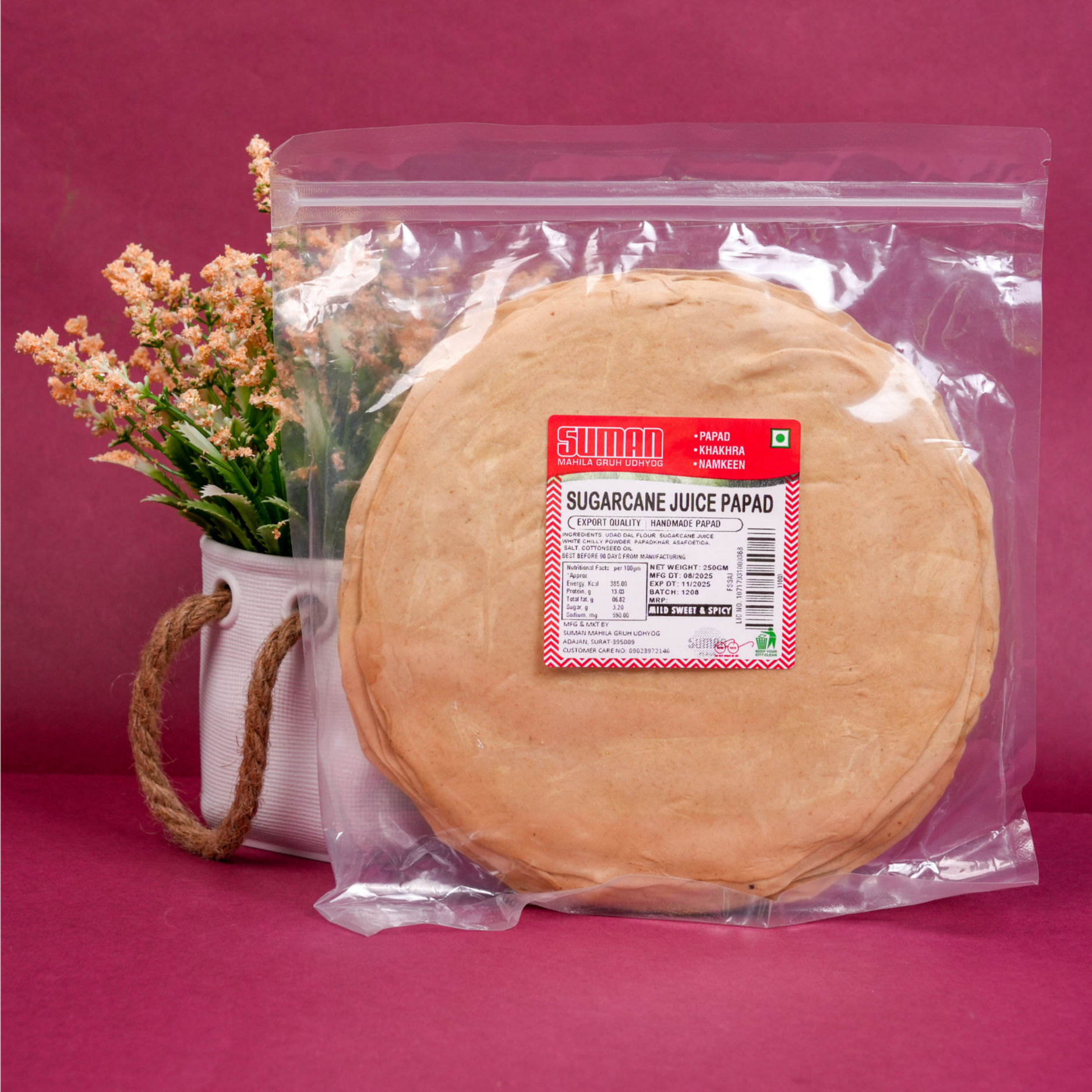 The Spice & Sweet Harmony pack features six expertly crafted papads: Moong Daal (Dhamta), Sweet & Spicy (Sugarcane), Tricolor, Amritsari, Single Mari, and White Chilli. This curated collection balances bold spices with subtle sweetness, offering a diverse range of authentic textures and flavors. Each papad is made from quality ingredients to deliver crispness and traditional taste, making this pack ideal for those seeking a refined blend of savory and sweet sensations in one celebration set.