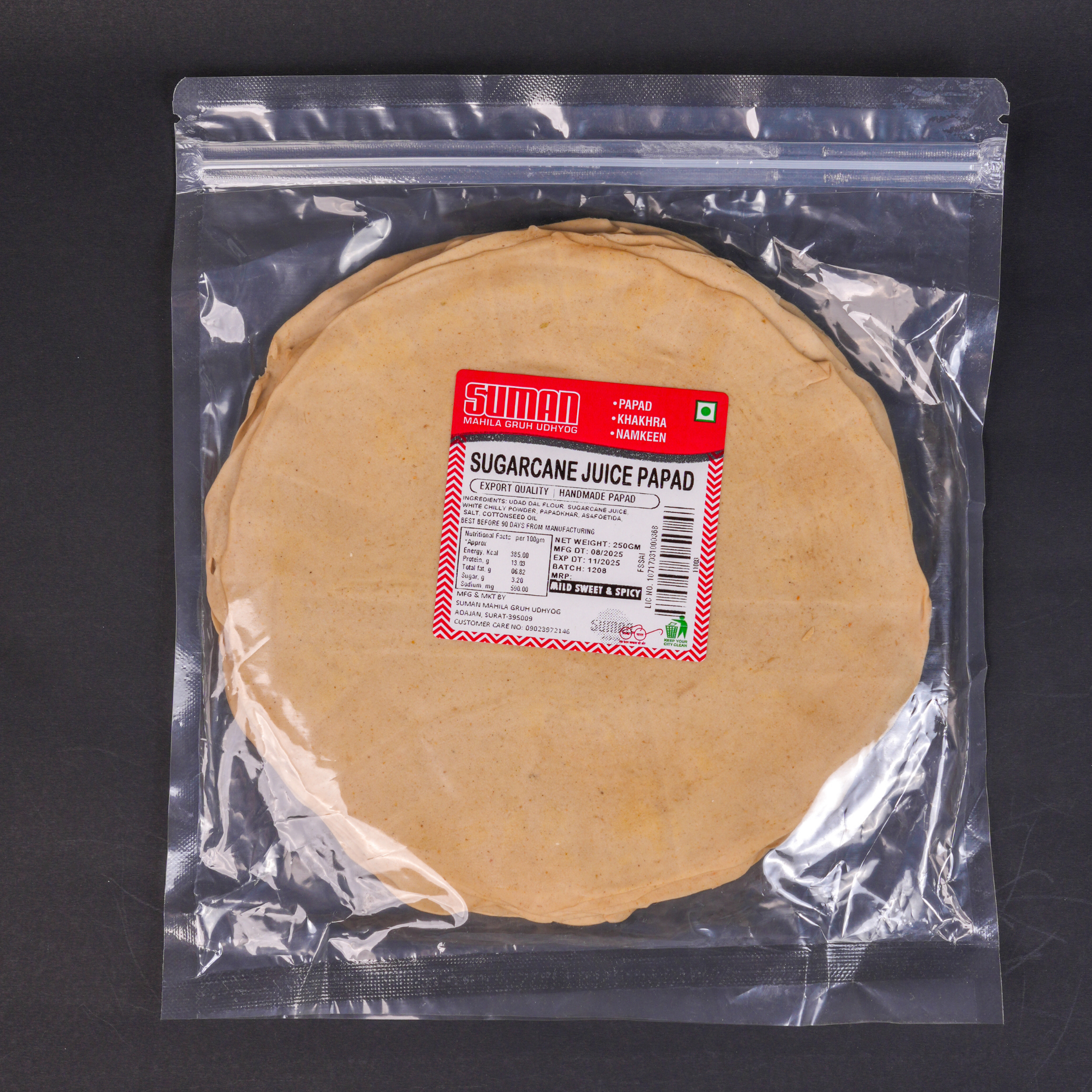 Sugarcane Juice Papad combines the natural sweetness of sugarcane juice with a traditional crispy texture. This unique papad offers a refreshing twist on classic snacks, providing a subtle sweetness alongside a satisfying crunch. Ideal as a healthy accompaniment or an innovative snack, it brings a distinctive flavor to your culinary experience.