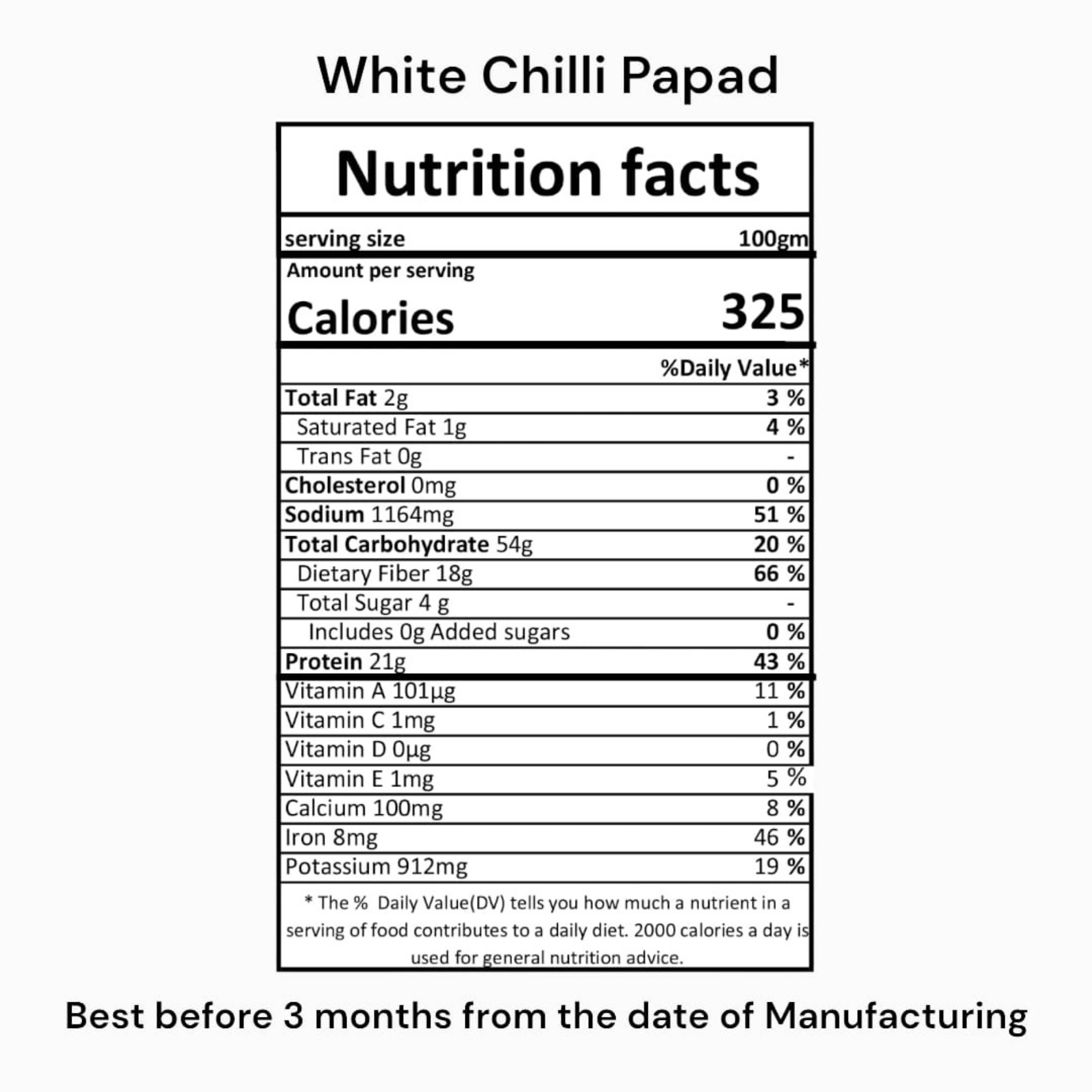 White Chilli Papad brings a unique heat and subtle flavor to traditional papads, made with carefully selected white chilli for a balanced spice profile. This expertly crafted snack offers a crispy texture that enhances any meal or serves as a flavorful standalone treat. Its refined seasoning highlights the distinct aroma and mild heat of white chilli, making it a preferred choice for those seeking an authentic and sophisticated taste experience.